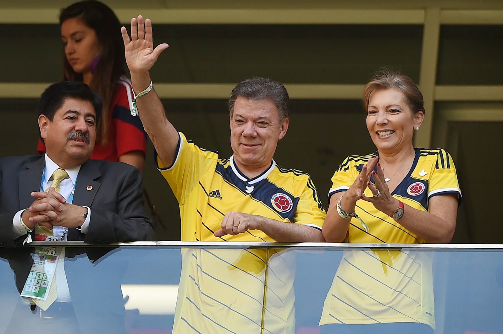 Colombian President Juan Manuel Santos (C) and his wife Maria Clemencia attend the match between Colombia and Ivory Coast.